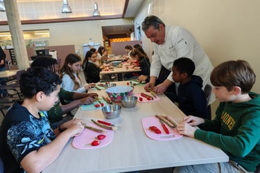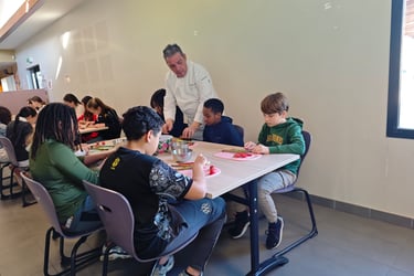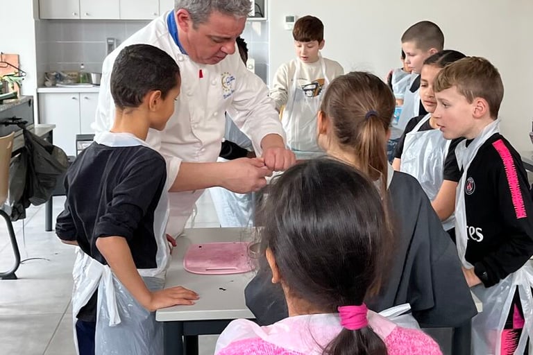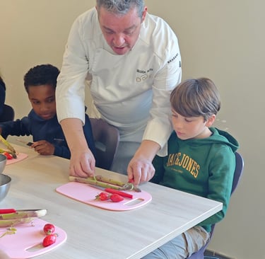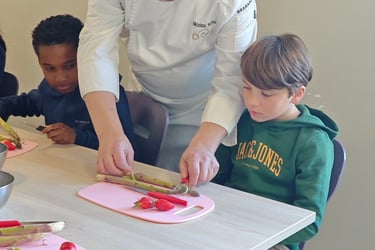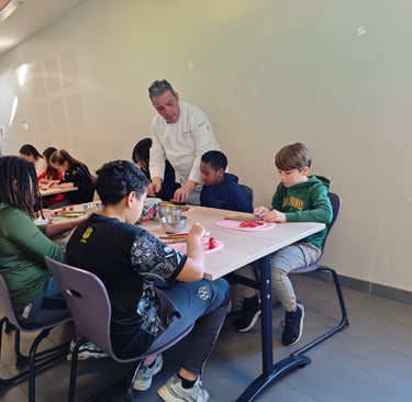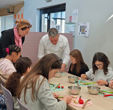 Sécurité et hygiène au menu d'une première séance de cuisine réunissant cet après-midi Nicolas Rota et deux groupes de 10 élèves de CE2, CM1 et CM2 de l'école élémentaire de Saint Ouen Les Vignes. Mise en pratique : préparation d'une petite salade mangue, avocat, oignon rouge avec épluchage, coupe et assaisonnement. Une opération composée de deux séances sur deux après-midi soutenue par ADPS Prévoyance santé. Transmettre aux jeunes générations le goût de la gastronomie, c’est également donner à la jeunesse les clés lui permettant de comprendre des réalités et des enjeux, pour lui permettre de faire adulte ses choix de manière consciente, comme citoyens et comme consommateurs. Transmettre aux jeunes générations le goût de la gastronomie, c’est pour finir donner à notre jeunesse le goût du bel ouvrage et du travail bien fait, le goût de s’engager dans des métiers où l’ascenseur social n’est pas en panne car le mérite y est encore reconnu, dans des filières professionnelles d’avenir quand la lutte contre le chômage des jeunes prend rang de priorité nationale. C’est aussi lui donner le goût d’innover et entreprendre