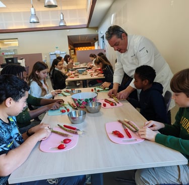 Aujourd'hui, Valérie LEGUEREAU, Administratrice et membre du bureau d’AXEREAL, est venue visiter deux classes de CE2 de l’école de Viroy à Amilly (45) parrainées par la coopérative céréalière dans le cadre du projet d’éducation à l’alimentation. Les élèves ont enfilé leurs tabliers pour préparer une fondue de poireaux et un houmous de betterave, sous la conduite du chef Nicolas ROTA